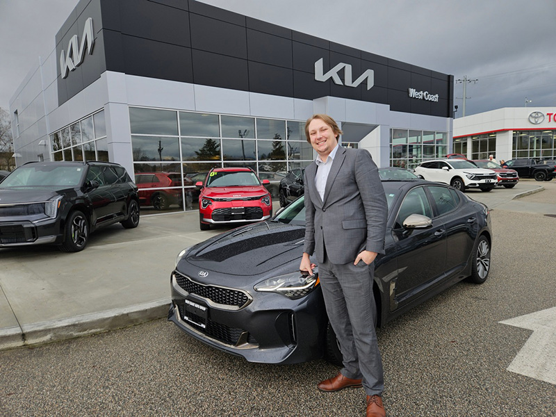 Pictured here is Branden Kupfer, our newest Sales Consultant at West Coast KIA, standing in front of the Vehicle of the Month — a gorgeous 2019 KIA Stinger GT-Line AWD. With its sleek lines, sporty stance, and premium design, this Stinger turns heads while showcasing the performance-driven style Kia is known for.