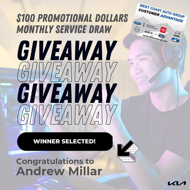 Each month, West Coast Kia will be randomly selecting a winner from the finalized service surveys in our system. The selected winner will receive $100 in Promotional Dollars that will be loaded on their West Coast Auto Group Customer Advantage Card. This month’s winner is Andrew Millar, you have been contacted via email and the dollars have been added to your card. If you wish to reach out directly, please email cr@westcoastkia.ca