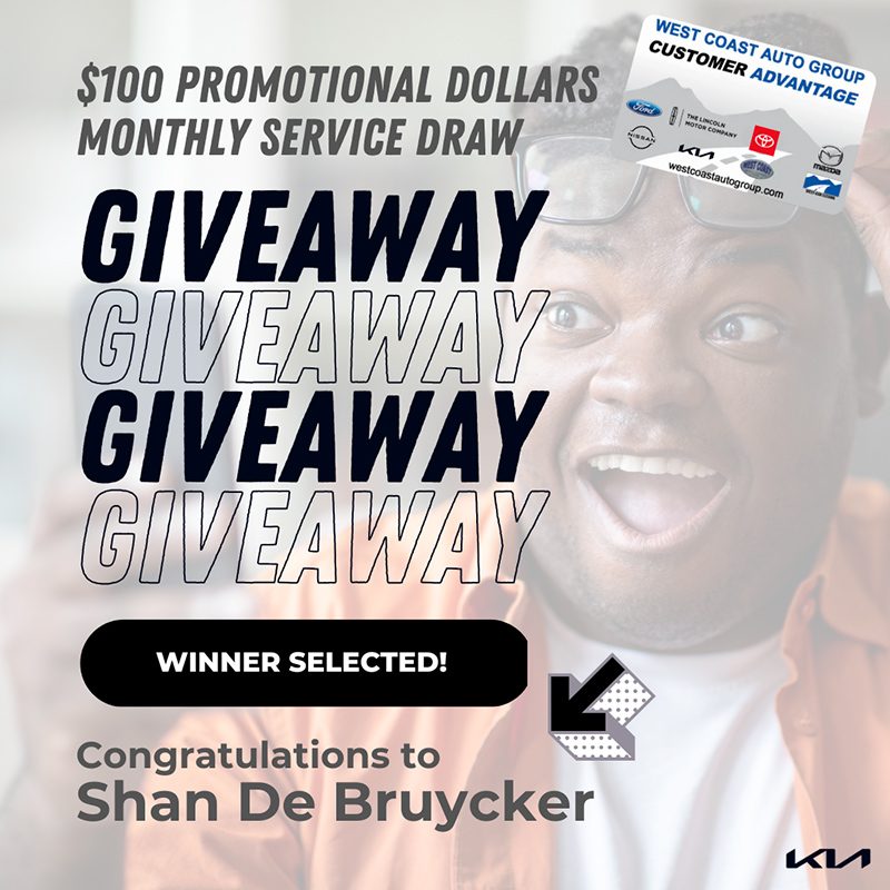 Each month, West Coast Kia will be randomly selecting a winner from the finalized service surveys in our system. The selected winner will receive $100 in Promotional Dollars that will be loaded on their West Coast Auto Group Customer Advantage Card. This month’s winner is Shan De Bruycker, you have been contacted via email and the dollars have been added to your card. If you wish to reach out directly, please email cr@westcoastkia.ca