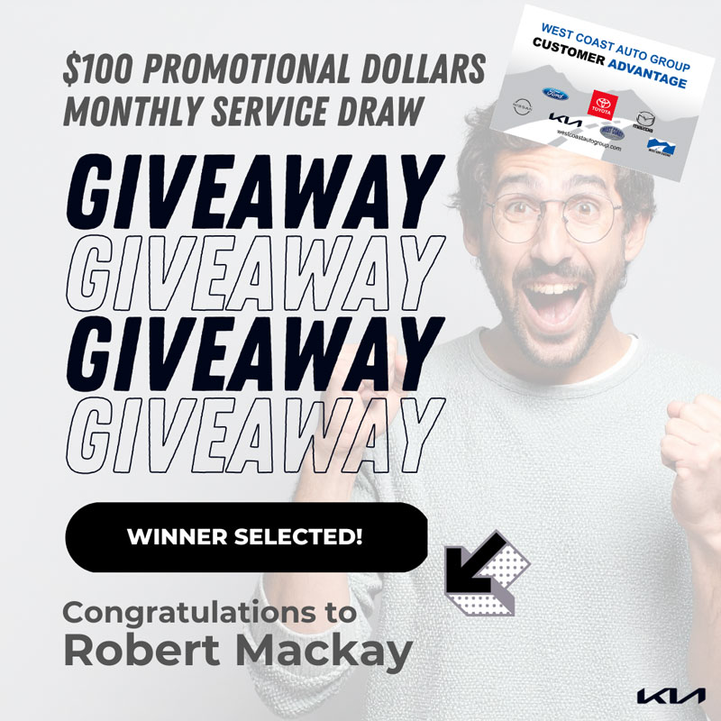 Each month, West Coast Kia will be randomly selecting a winner from the finalized service surveys in our system. The selected winner will receive $100 in Promotional Dollars that will be loaded on their West Coast Auto Group Customer Advantage Card. This month’s winner is Robert Mackay, you have been contacted via email and the dollars have been added to your card. If you wish to reach out directly, please email cr@westcoastkia.ca